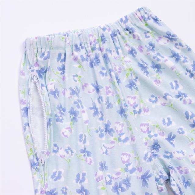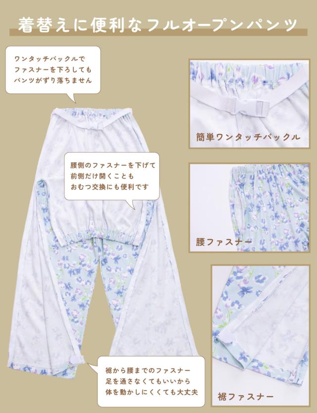 パンツには腰から裾までのファスナーでフルオープン仕様、着替えのサポートにも適しています。