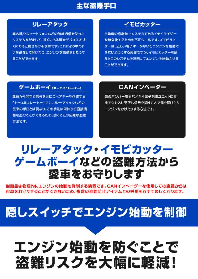 「リレーアタック」「イモビカッター」「ゲームボーイ」などの盗難方法から大切なお車を守ります。