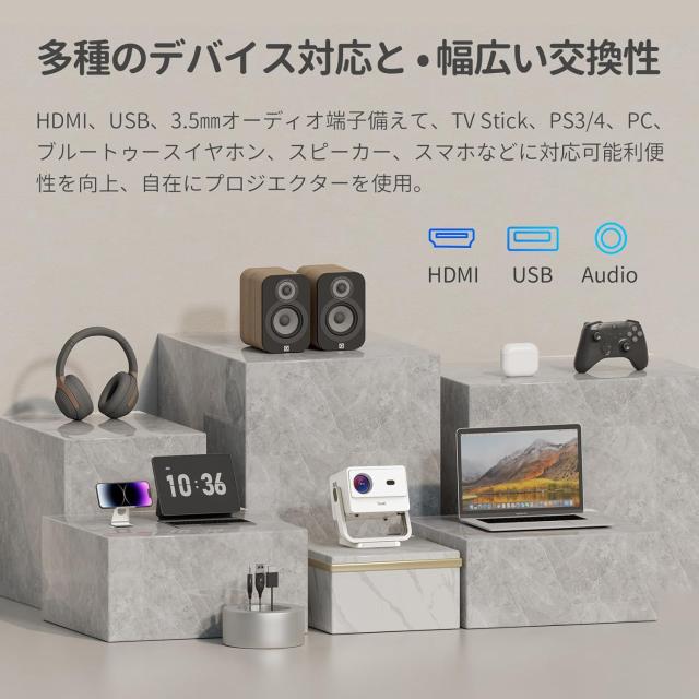 小型で一体型スタンド付き、操作簡単、180°広範囲回転角度で設置の便利さが一層増して、前も天井もどこでも投影画面が見られる、寝ながら天井に投影できてベッドで見る家で映画館気分が味わえる。
