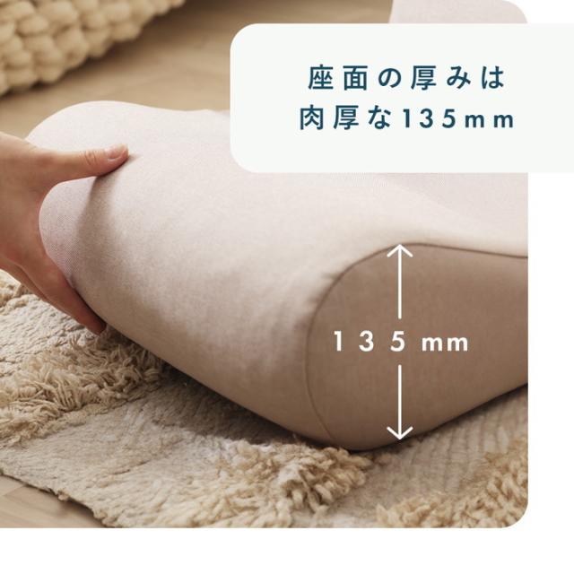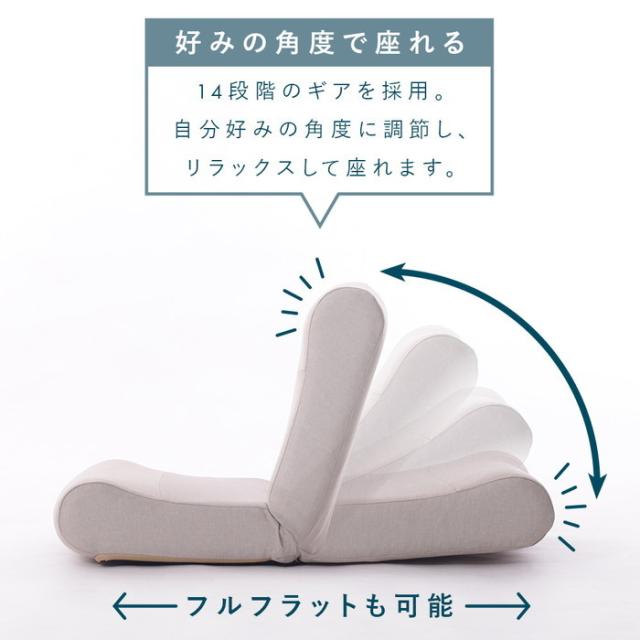 コンパクトでユニークなデザインの座椅子。コンパクトながら程よい座面の厚みは肉厚な135mm。適度な弾力で座りやすいのが特徴です。また、14段階のギアを採用しているので、自分好みの角度に調節してリラックスして座れます。