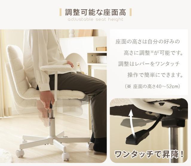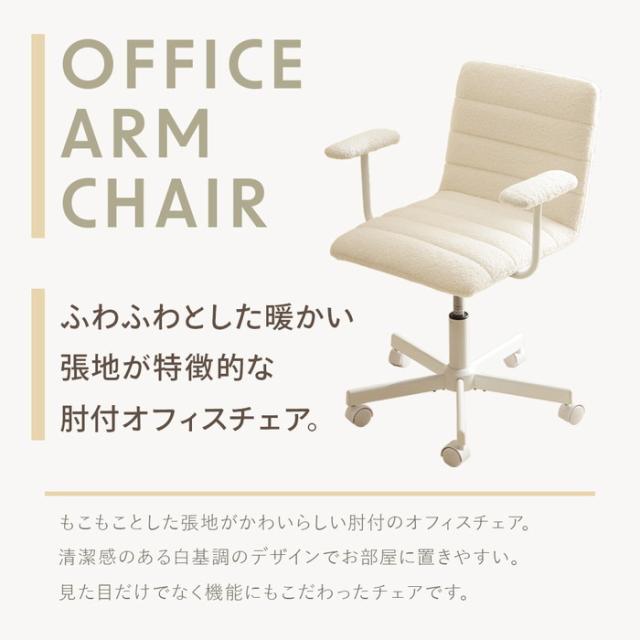 | 商品説明 | もこもことした張地がかわいらしいアームレスト付きのオフィスチェアです。清潔感のある白基調のデザインでお部屋に置きやすく、見た目だけでなく機能にもこだわりました。 |