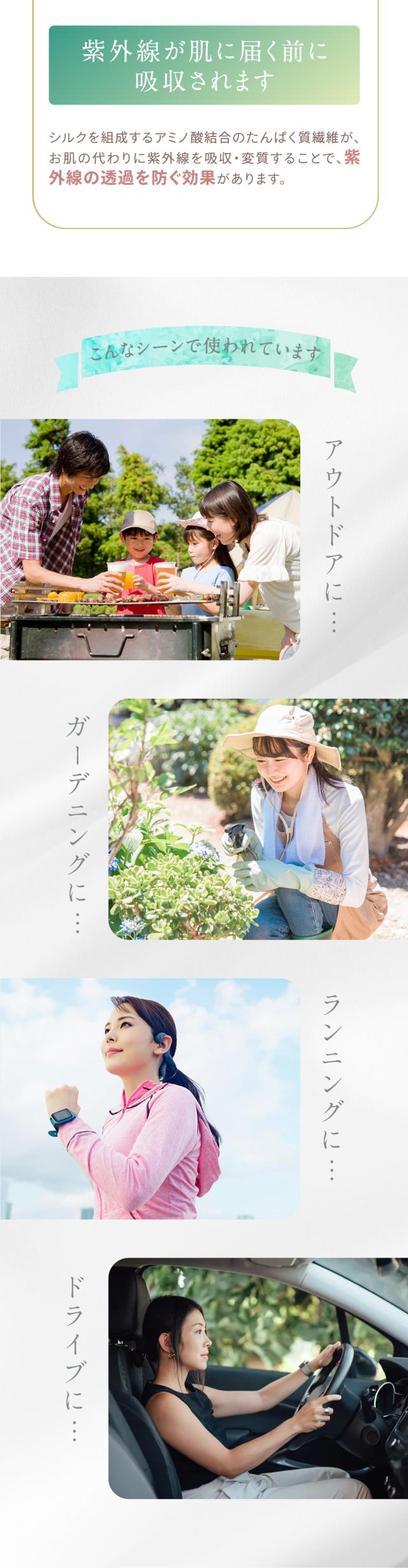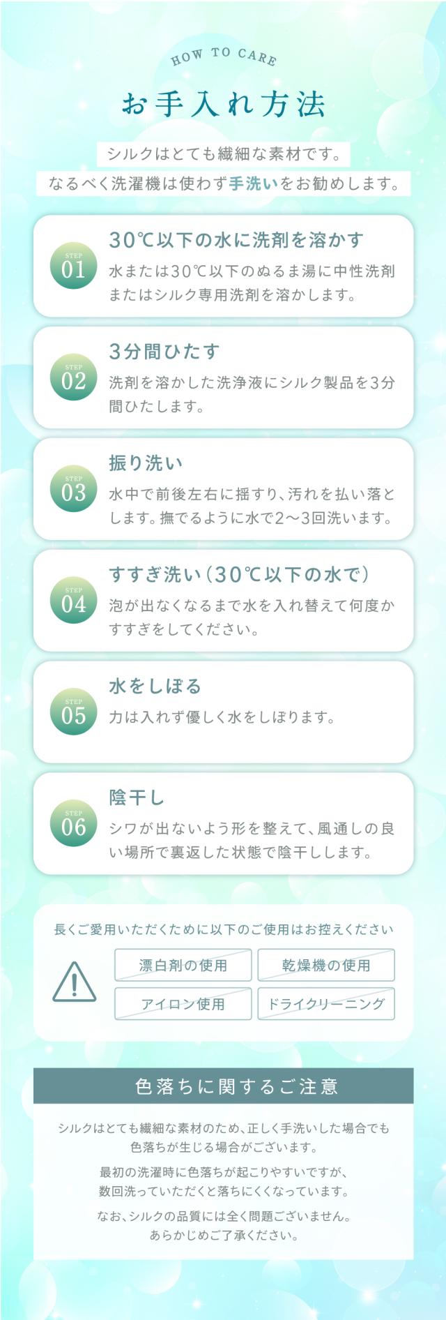 | お手入れ方法 | シルク100%のため、できるだけ手洗いをしてください。 (1)ぬるま湯(30℃以下)に中性洗剤を溶かし、やさしく押し洗いしてください。 (2)洗剤が残らないよう、きれいな水でやさしくすすぎます。 (3)軽く押さえるようにして水気を取り、タオルに包んで軽く水分を吸い取ります。 (4)直射日光を避け、風通しのよい日陰で平干ししてください。 (5)必要な場合は当て布をし、低温(110℃以下)で軽くアイロンをかけてください。 |