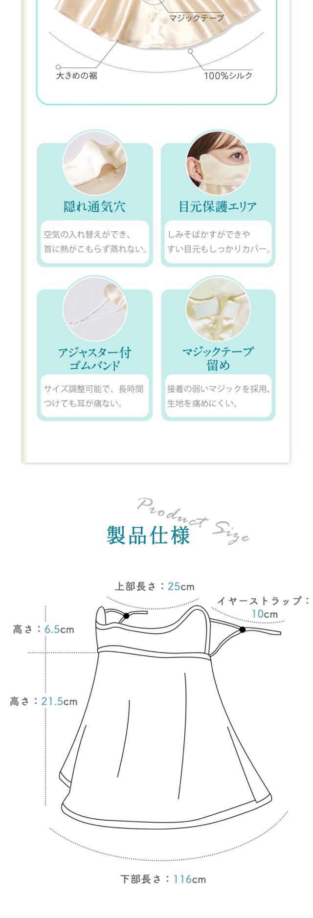 ・ 肌にやさしい天然シルク100% 摩擦や刺激を抑え、敏感肌の方にも安心。肌触りがなめらかで、長時間つけても快適です。 ・高い保湿効果で乾燥を防ぐ シルクが肌のうるおいを保ち、乾燥や荒れをケア。スキンケア後の潤いをキープします。 ・通気性・吸湿性に優れムレにくい 汗や湿気をすばやく吸収・放出し、さらっとした着用感を維持。 ・軽量でやわらかい着け心地 薄くて軽い生地が顔にフィットし、息苦しさを感じにくい仕様。 |