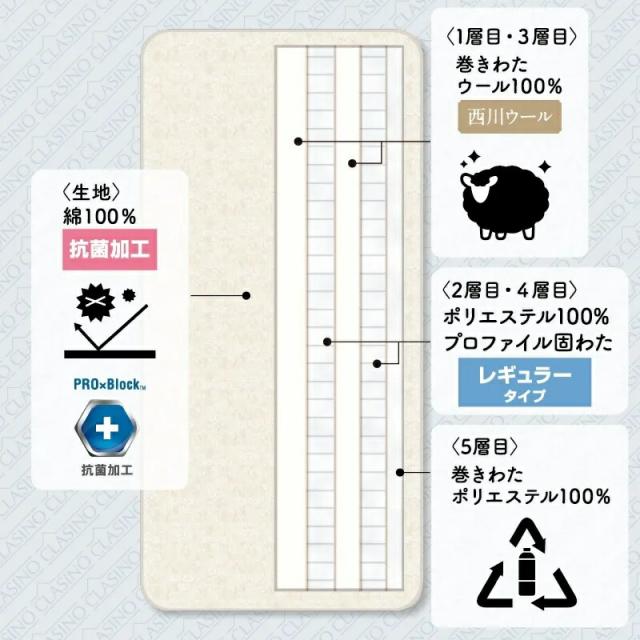 西川 クラシノ 羊毛 敷布団 5層 西川ウール エアリーメッシュ シングル 100x210cm 厚み8cm CA5001 AD05263004 AIRYMESH 5.0kg 西川リビング clasino 抗菌加工 マチ付き吸汗固わた 衛生的 清潔 日本製 しっかり敷きふとん