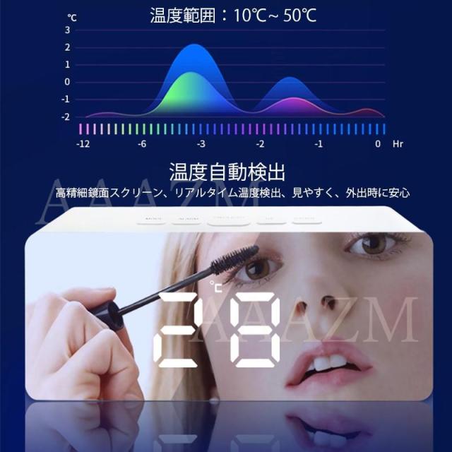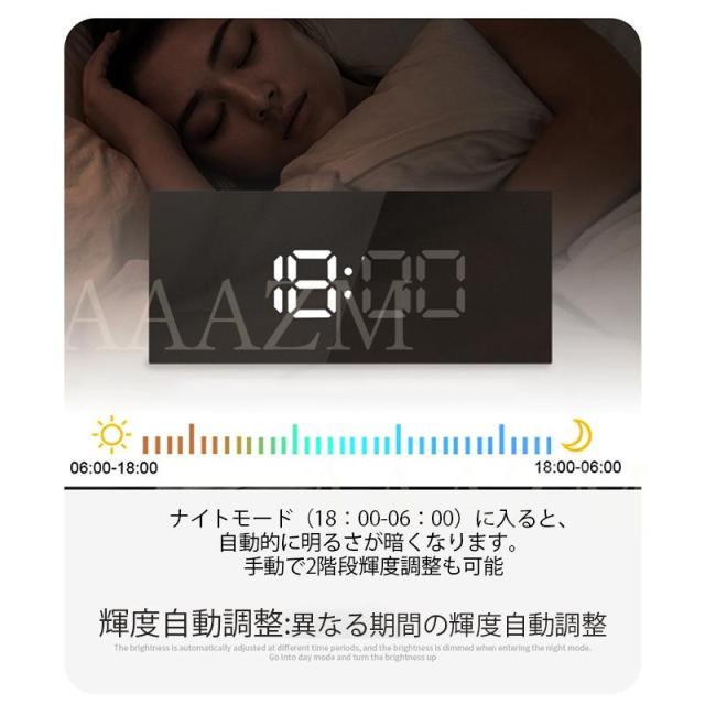 商品機能:日付 温度計 カレンダー アラーム 簡単操作 自動調光 ミラー 夜間モード USB充電 省電