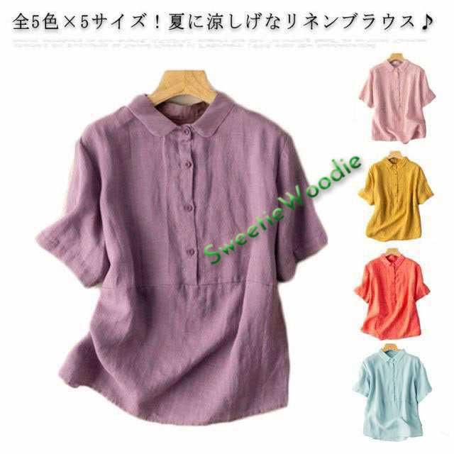 リネン ブラウス レディース 丸襟 綿麻 ブラウス トップス 半袖ブラウス ナチュラル 前開き リネン コットン カジュアル ウエスト切り替え ゆったり シンプル 無地 薄手 春 夏 大きいサイズ 送料無料 可愛い 大人 おしゃれ