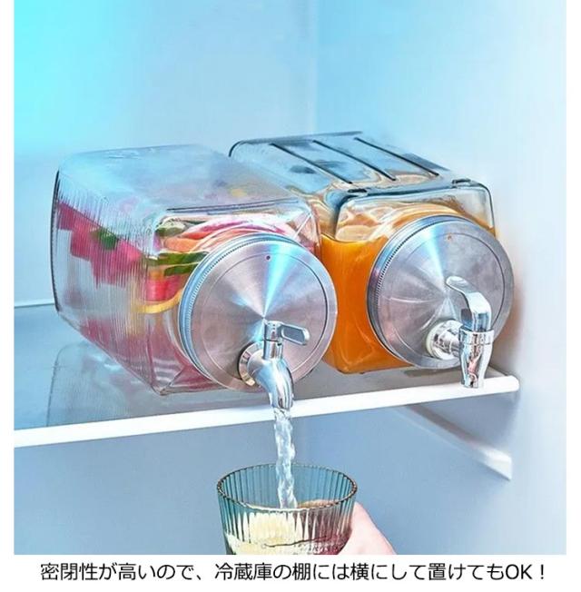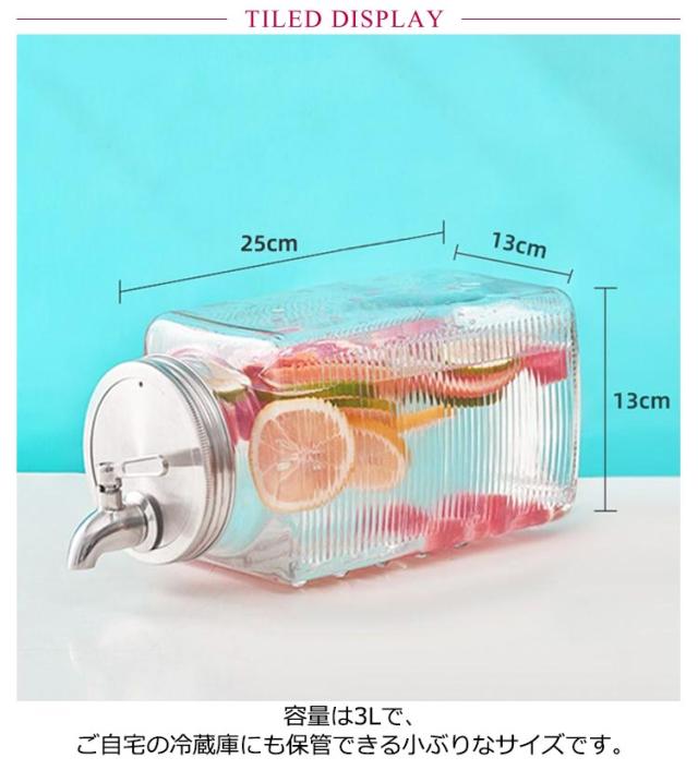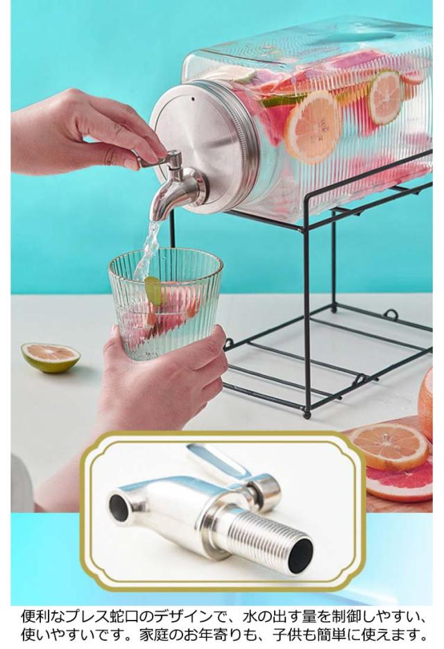 | ガラス&ステンレス製3L大容量ピッチャー。【横置き】 容量は3Lで、ご自宅の冷蔵庫にも保管できる小ぶりなサイズです。 密閉性が高いので、冷蔵庫の棚には横にして置けてもOK! ボトル容器の口部分は、大きめの作りなので果物やお花なども入れやすくお手入れがしやすいのもポイントです。 便利なプレス蛇口のデザインで、水の出す量を制御しやすい、使いやすいです。家庭のお年寄りも、子供も簡単に使えます。 | |