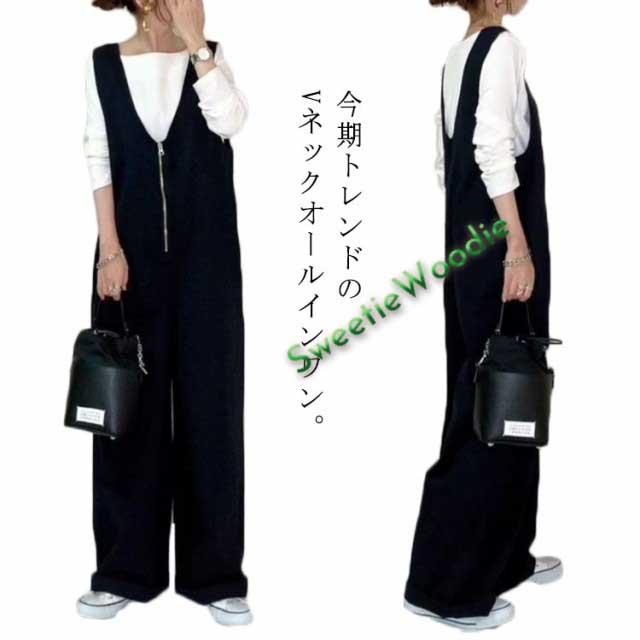 Vネックジップオールインワン サロペット ワイドパンツ ジャンプスーツ オールインワン オーバーオール フロントジップ ゆったり ロングパンツ レイヤード リラックス カジュアル 大人カジュアル 春 秋冬 ワイド ワイドシルエット