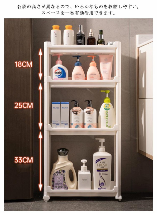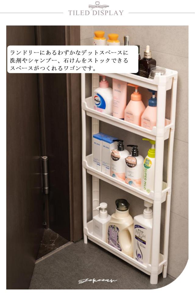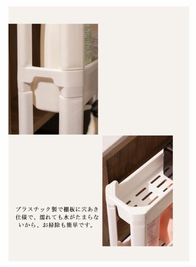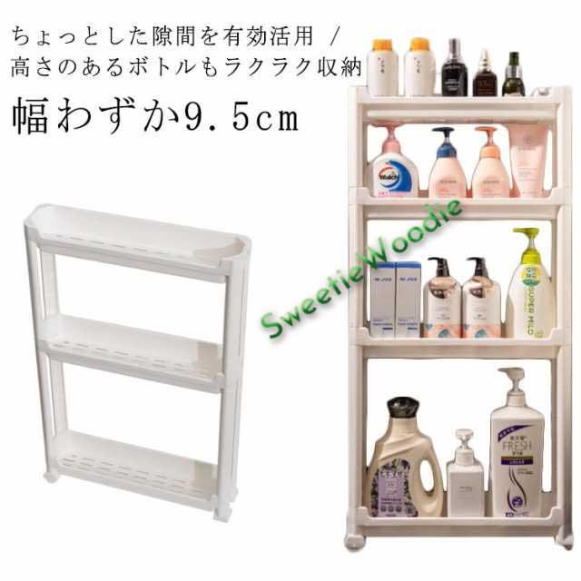| 幅わずか9.5cm ちょっとした隙間を有効活用 / 高さのあるボトルもラクラク収納 各段の高さが異なるので、いろんなものを収納しやすい。スペースを一番有効活用できます。 たった幅9.5cm、気になる食器棚の横やレンジ台の脇など、調味料や飲料水のストックに使ったり、ちょっとした隙間にスッと収納できます。 キッチン以外でも使え、色んな場所で大活躍します。洗面所ではランドリーや洗面の隙間の収納、トイレではペーパーホルダーラックとしても使えます。 ランドリーにあるわずかなデットスペースに洗剤やシャンプー、石けんをストックできるスペースがつくれるワゴンです。 プラスチック製で棚板に穴あき仕様で、濡れても水がたまらないから、お掃除も簡単です。 ネジもなく、工具不要で組立簡単です。はめ込むだけなので、女性一人でも簡単に組み立てることができます。 安定感抜群の脚も移動がラクラクのコロも両方付属で、シーンやお好みに合わせてご利用いただけます。 | |
