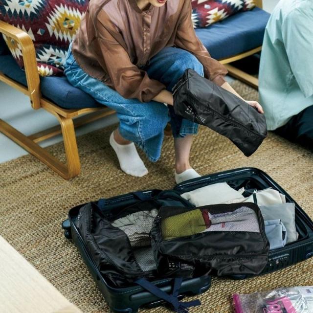 長期の海外旅行などのLサイズのスーツケースにぴったり収まるS/M/Lサイズの衣類収納ポーチ3点がセットになった収納ケース。
