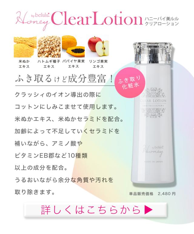 ●クリアローション(150ml) 拭き取りタイプの化粧水。クラッシィと併用で古い角質や汚れをすっきり除去。