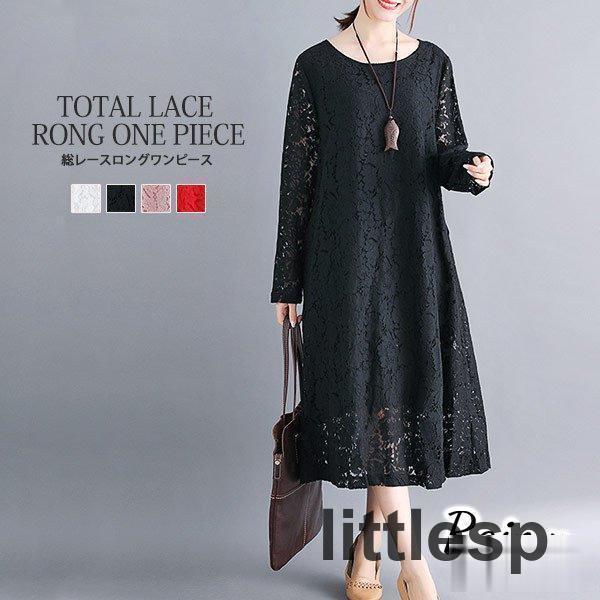 ワンピース 総レース ドレス ロング丈 長袖 上品 春 夏