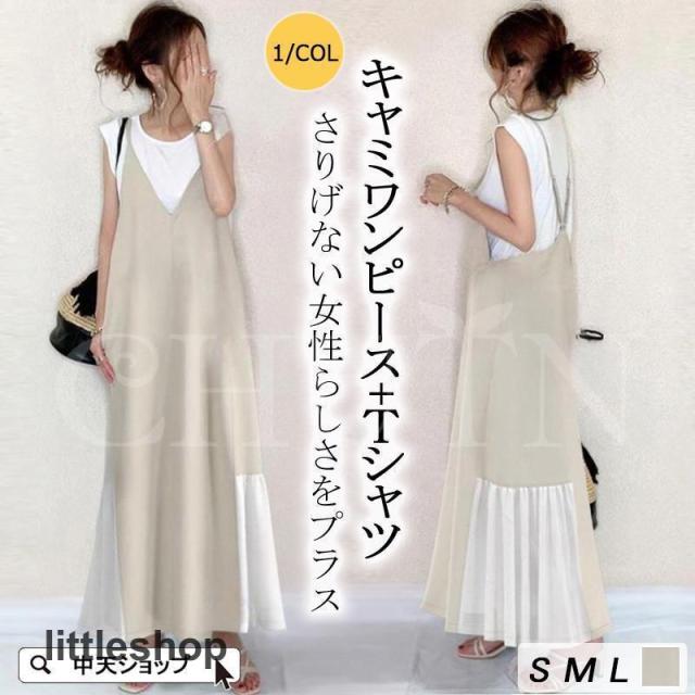 キャミワンピース セットアップ サロペットレディース マキシワンピース+白tシャツ 夏服 ドッキングワンピ ロング vネック フレンチ袖tシャツ おしゃれ大人