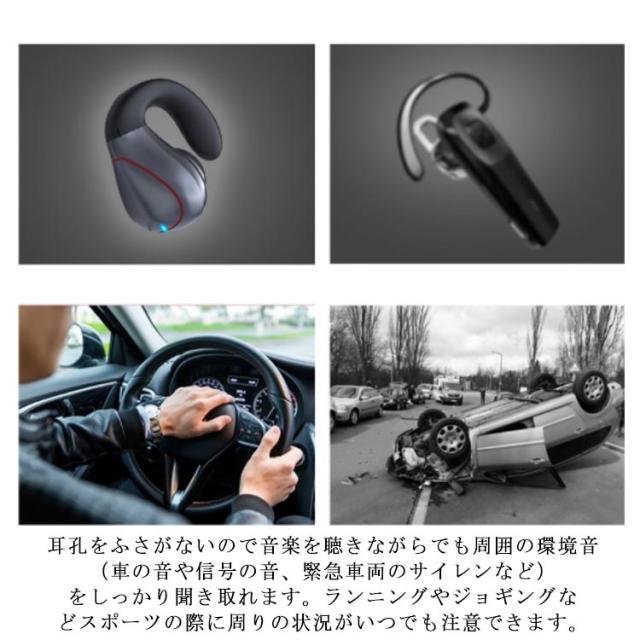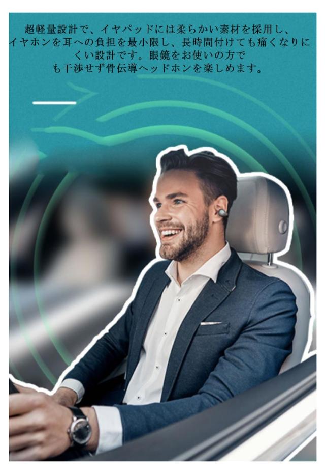 | 耳をふさがず開放感たっぷりに音楽を楽しめる骨伝導 ヘッドホンです。 耳孔をふさがないので音楽を聴きながらでも周囲の環境音(車の音や信号の音、緊急車両のサイレンなど)をしっかり聞き取れます。ランニングやジョギングなどスポーツの際に周りの状況がいつでも注意できます。 Bluetooth5.0が搭載されたワイヤレスイヤホン通信速度範囲安定性が飛躍的に向上し、従来のBluetoothイヤホンの通信問題、音飛び、途切れも有効的に改善されました。 CVC8.0ノイズキャンセリング技術で、ハンズフリー通話の際にノイズに邪魔されることなく、相手と快適に通話できます。通話中の雑音や周囲のノイズを抑制し、相手の声も聞き取りやすく快適な通話を実現します。 高性能リチウムバッテリ内蔵のBluetooth イヤホン、連続通話時間最大6h、通勤&通学をより楽しい時間に。 スマホのホーム画面上にBluetooth イヤホンのバッテリー残量が表示される親切設計で残量不足を心配せずご使用いただけます。柔らかい素材を採用し、長時間の再生でも痛くなりにくい設計! 超軽量設計で、イヤパッドには柔らかい素材を採用し、イヤホンを耳への負担を最小限し、長時間付けても痛くなりにくい設計です。眼鏡をお使いの方でも干渉せず骨伝導ヘッドホンを楽しめます。 多機能の操作は片手でも操作行います。再生/一時停止、音量の調節、前/次の曲、着信コールの応答/拒否/終了、簡単に制御できます。また、通話と音楽の切り替えが容易で、音楽中でも着信を見逃すことはありません。 | |