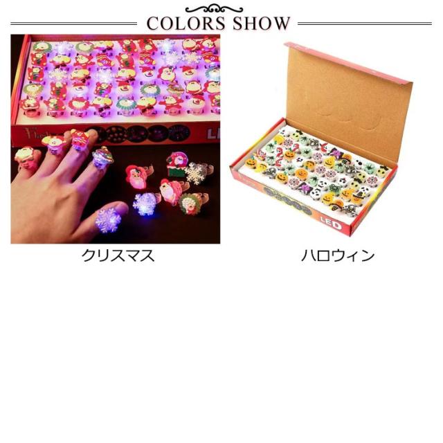 | ・LED内蔵でピカピカ光る楽しいハロウィンリング&クリスマスリング! ・子どもが大好きな光るおもちゃ! ・キッズ用の光る指輪 ・お祭り・縁日・コンサートで圧倒的に人気なリングライトとなります。 ※種類は取り混ぜ、カラーの指定はできません。同色が入る場合がございますのでご了承くださいませ。 | |