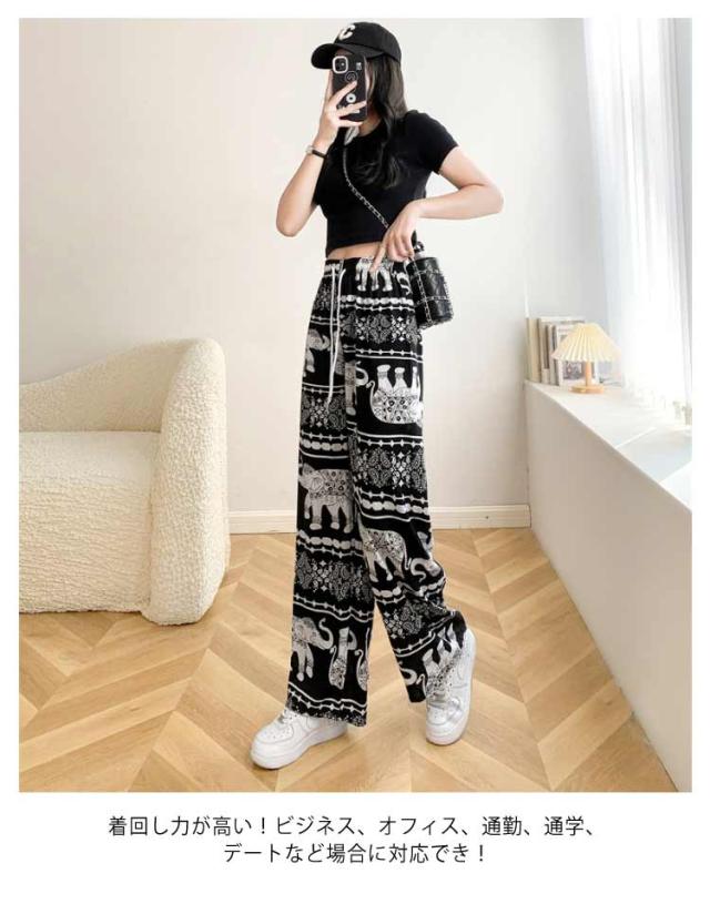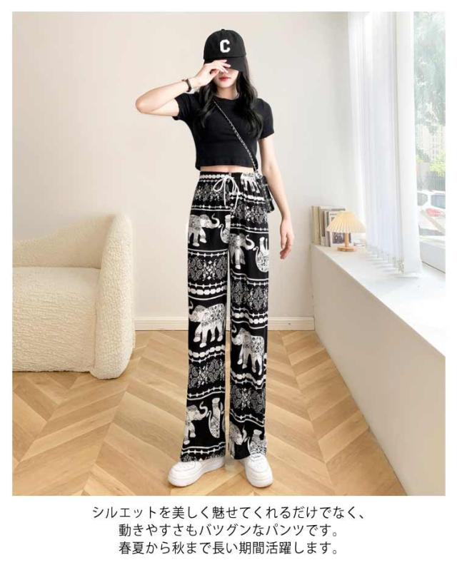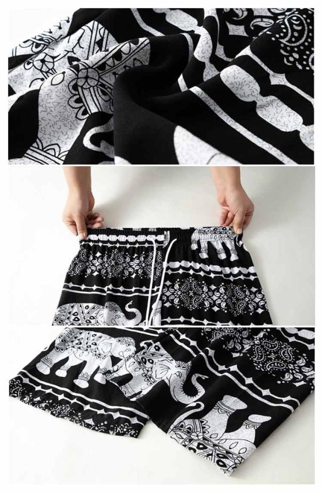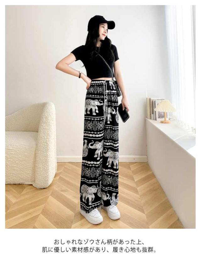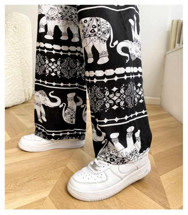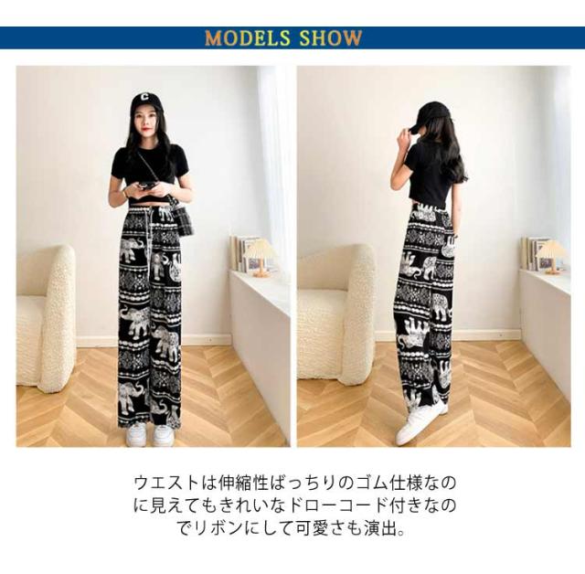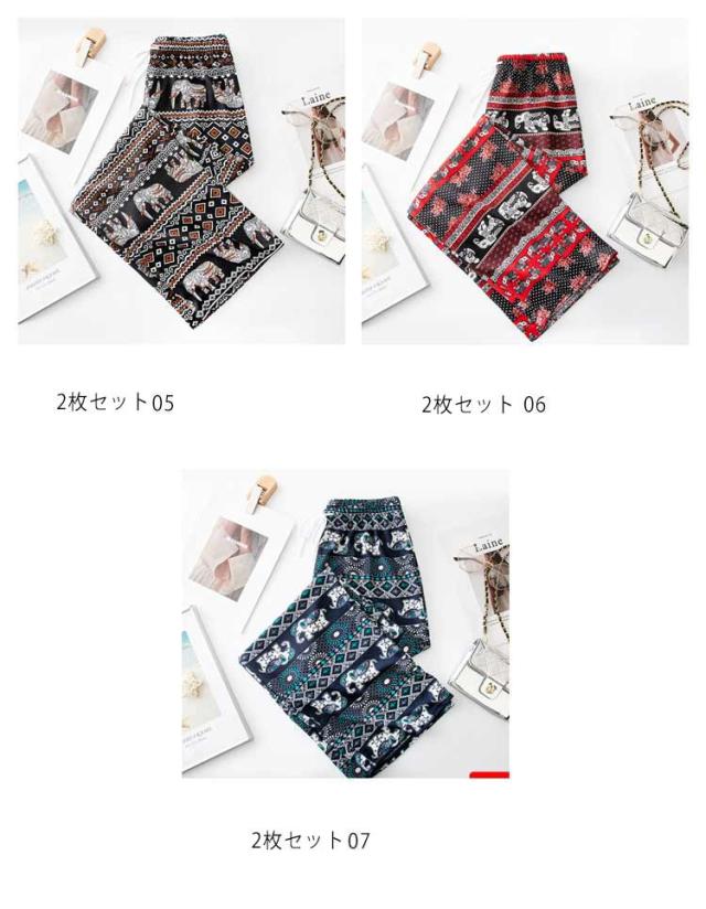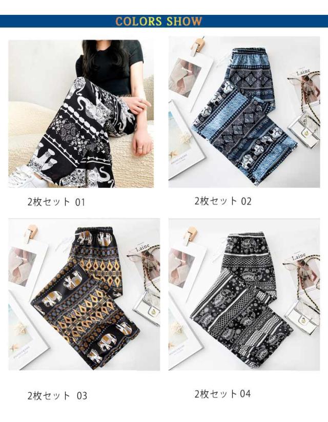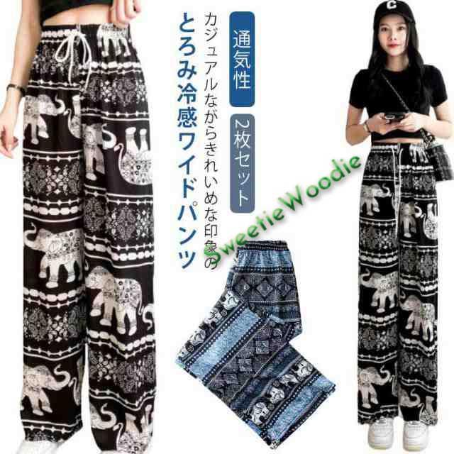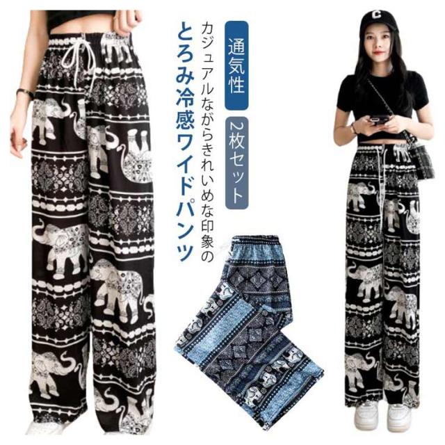 【2枚セット】接触冷感 パンツ ゆったり エスニック 部屋着 タイパンツ 象柄 ゾウ 【2枚セット】接触冷感 ルームウェア 冷感 ワイドパンツ 涼感 夏 レディース 薄手 落ち感 ロングパンツ 涼しい 通気性 体型カバー 柄パンツ ヨガパンツ ボヘミアン風 旅行 ハイウエスト