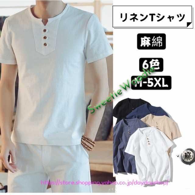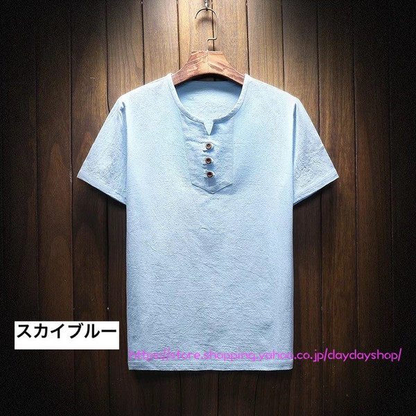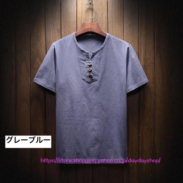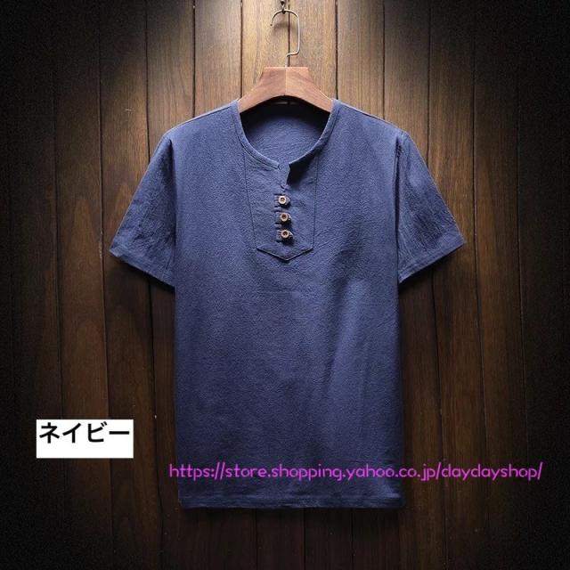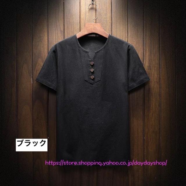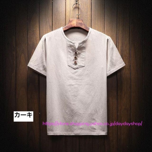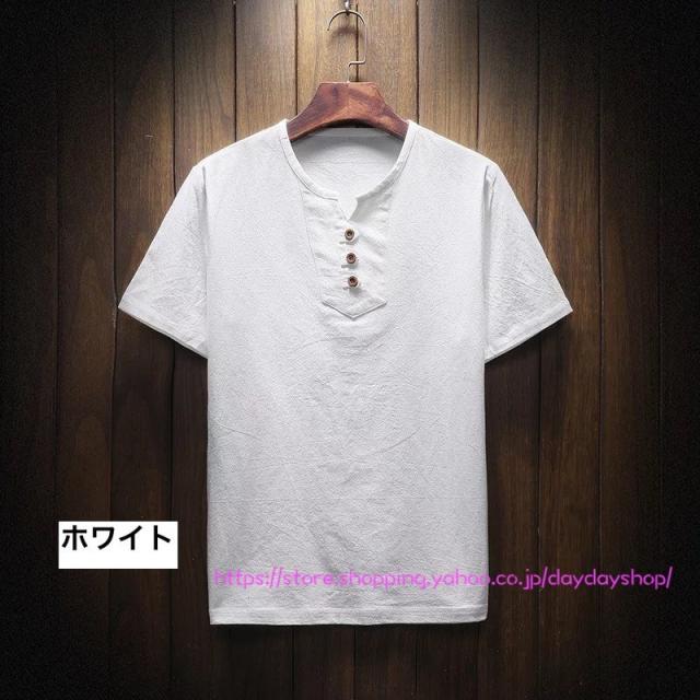 メンズリネンシャツ 半袖Tシャツ トップス 綿麻Tシャツ 無地 ボタン付き スリム Vネック tシャツ 大きいサイズ カジュアルシャツ 通気 涼しい 通勤通学 父の日