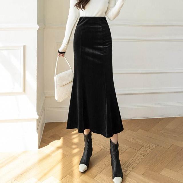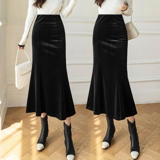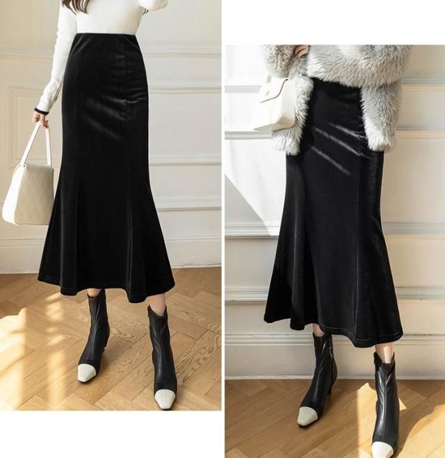 スカート タイトスカート マーメイドスカート ロングスカート ミモレ スリム 細身 マーメイド バックファスナー 中厚手 ベロア 大人可愛い きれいめ シンプル カジュアル 上品 こなれ感 ガーリー 主役級 都会的 無地 春 秋 冬 通勤 学生 通学 デート お出かけ 旅行 女子会 休日 合コン コンパ カフェ オルチャン 暖かい 脚長 普段使い モテ トレンド インスタ映え S M L XL ブラック