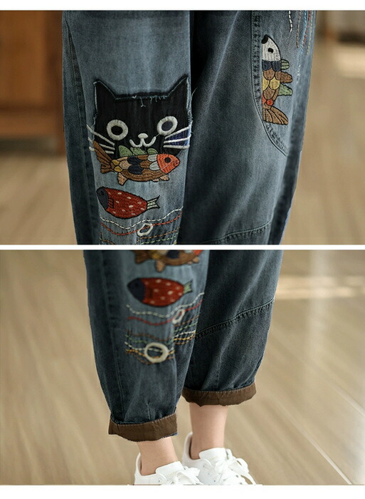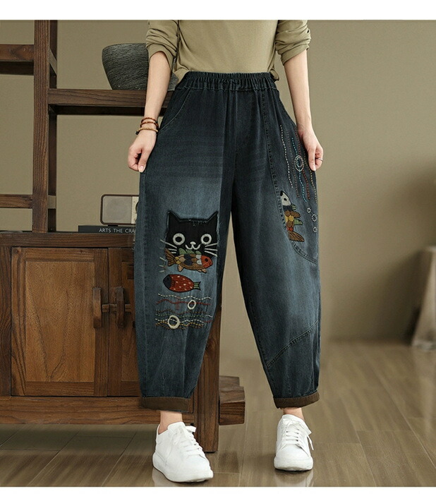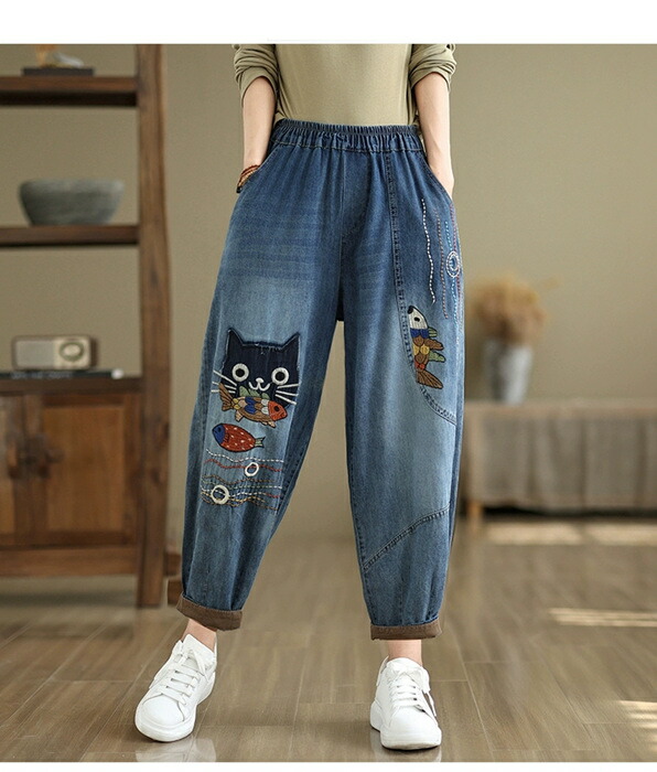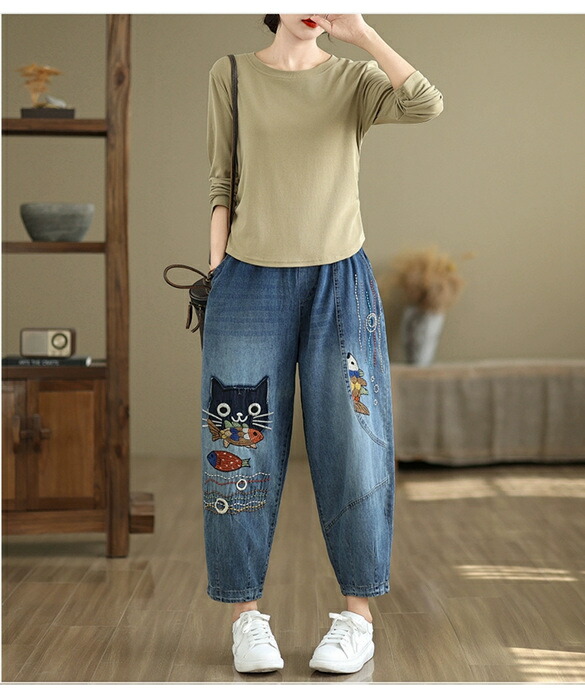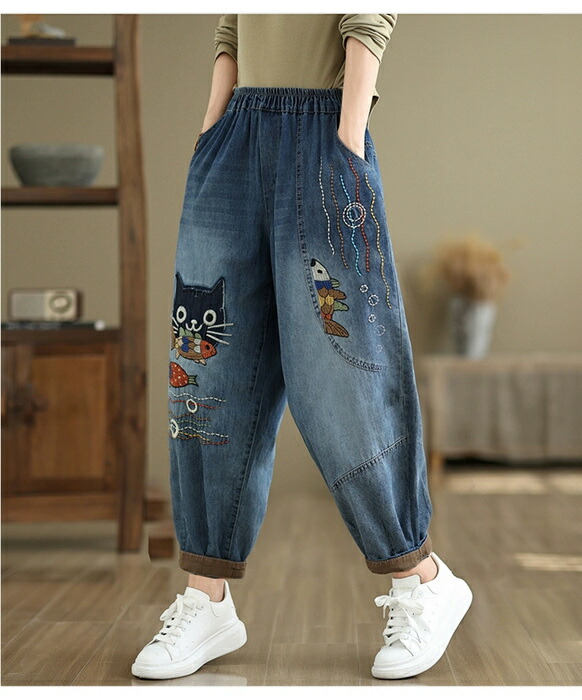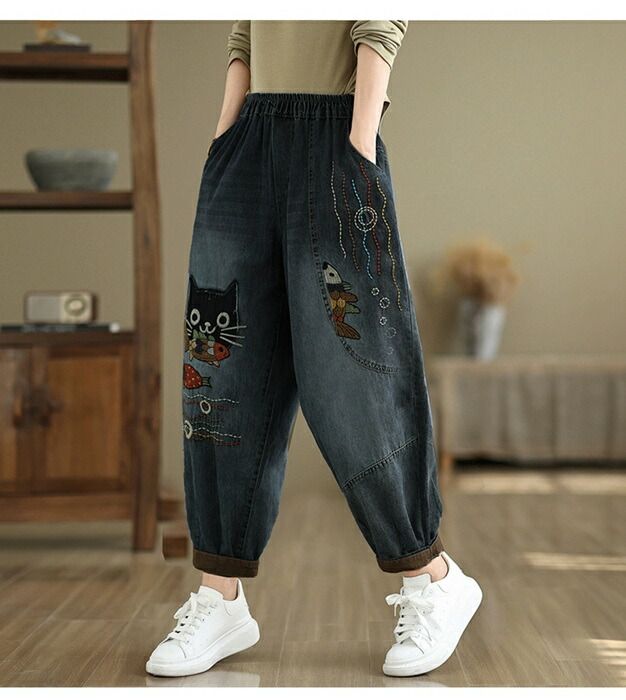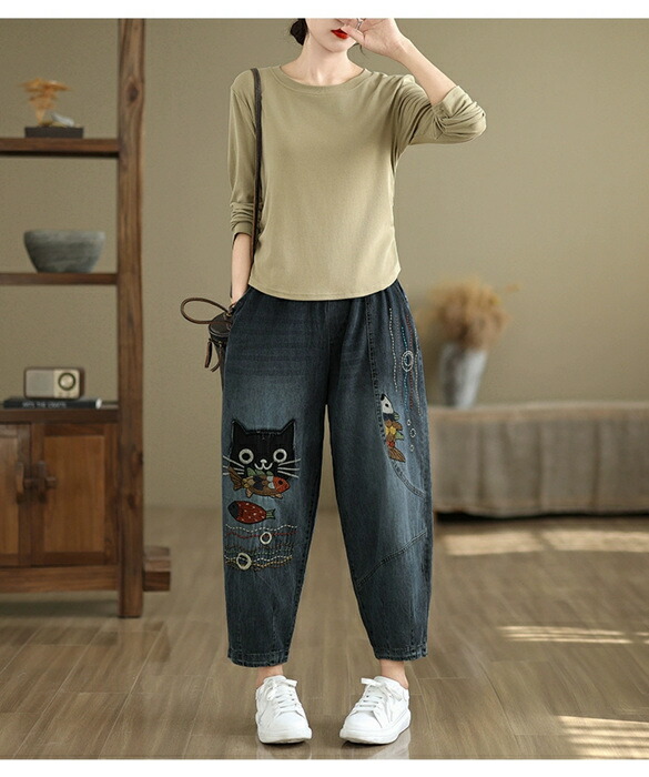 デニムパンツ ロング レディース 春秋 猫 ネコス テーパードパンツ 可愛い きれいめ パンツ ハイライズデニムパンツ ウエストゴム デニム 大人気 ワイドデニム ロールアップ ノア ボトムス
