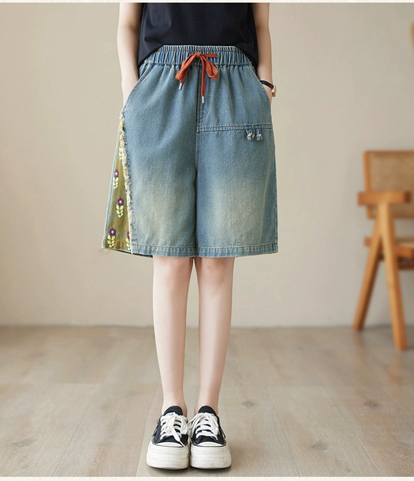 デニム ハーフパンツ ショートパンツ デニムパンツ 夏 切替え 花柄 可愛い レディース ワイドパンツ きれいめ ガウチョパンツ スカーチョ 大きいサイズ カジュアルウエストゴム ボトム バギーパンツ