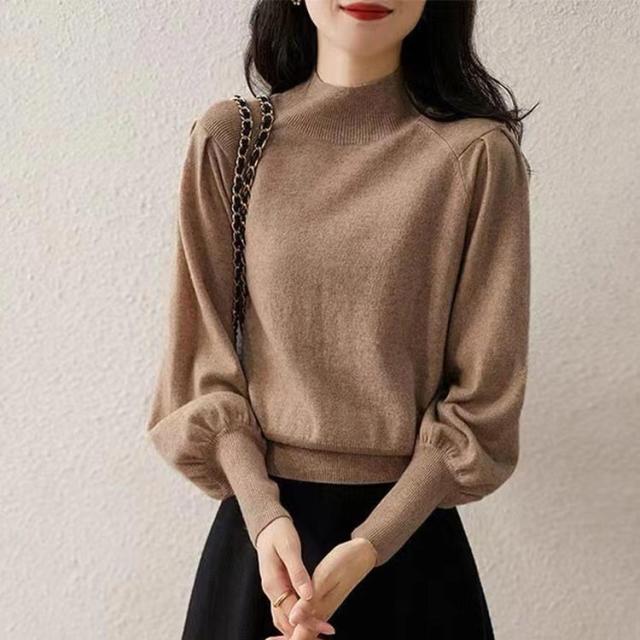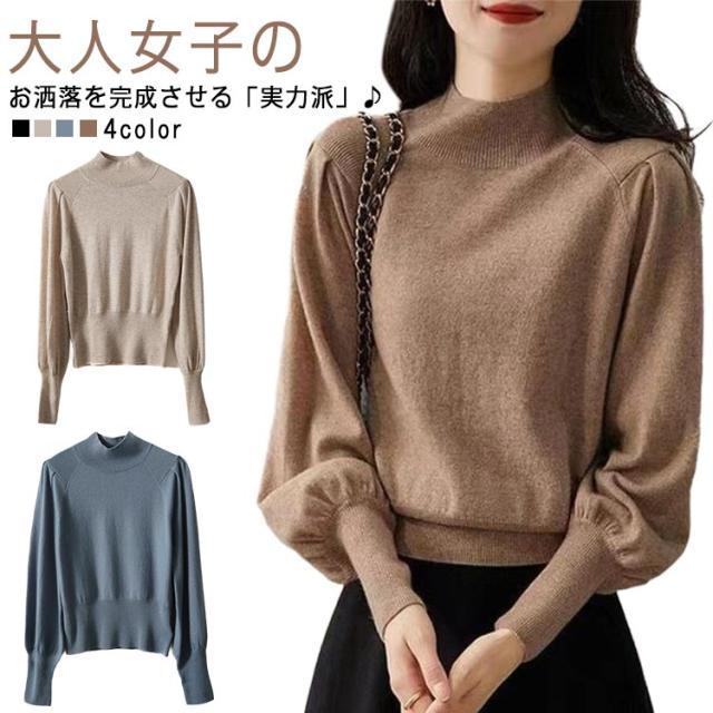 ハイネック 春 ニット ボリューム袖 プチハイネック ニットセーター ニットトップス パフスリーブ ショート丈 大人女性 セーター チュニック トップス 定番 長袖 シンプル ニ 無地