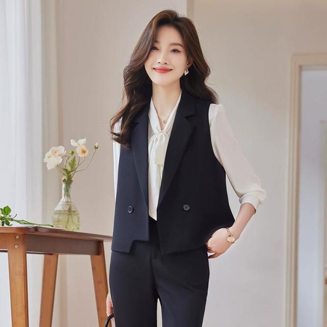 ブラウス+ベスト+パンツのセットアップ。