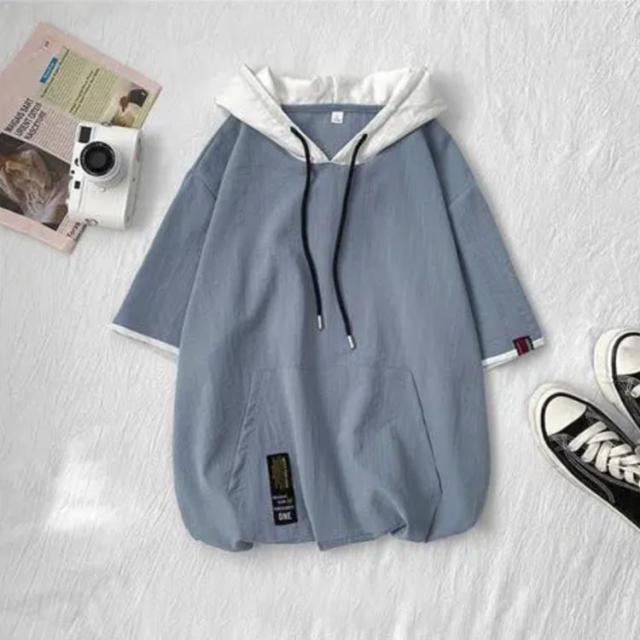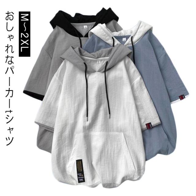 切り替え 五分袖 春夏 トップス メンズ 大人 フード付き 半袖 tシャツ プルオーバー おしゃれ カジュアル 薄手 夏用 男性 ゆったり 涼しい 配色 パーカー 無地 シンプル フード付きtシ 通学
