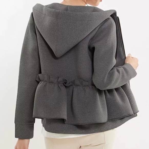 アウター パーカー ショート丈 袖付き 長袖 襟なし フード付き 前開き ファスナー フリル 厚手 かわいい 大人可愛い きれいめ シンプル 大人 上品 おしゃれ 大人女子 レトロ こなれ かっこいい