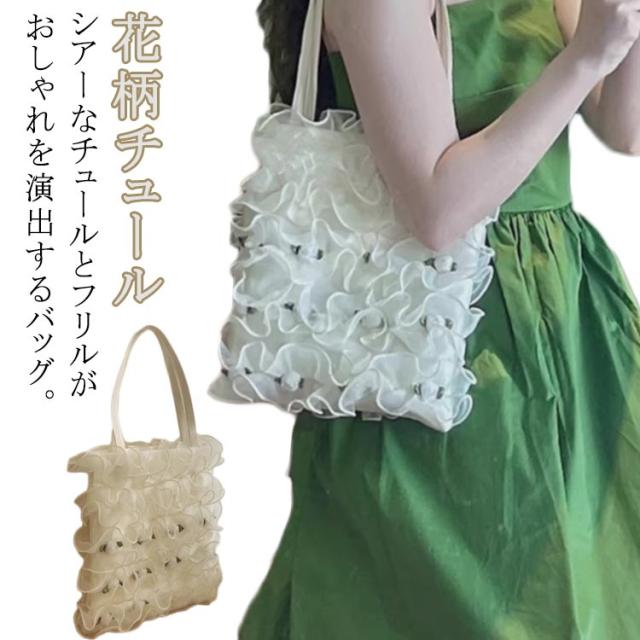 バッグ レディース ショルダーバッグ 花柄チュール フリル トートバッグ チュールバッグ かわいい ハンドバッグ オールシーズン お出かけ デイリー カジュアル ふわふわ 肩掛け ショルダーバ シアー