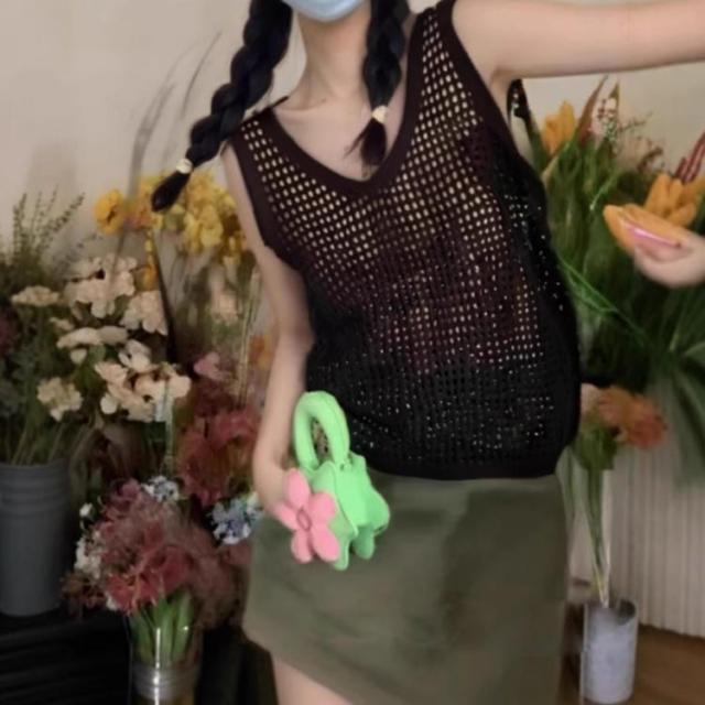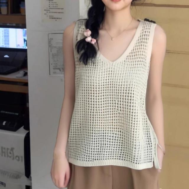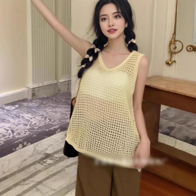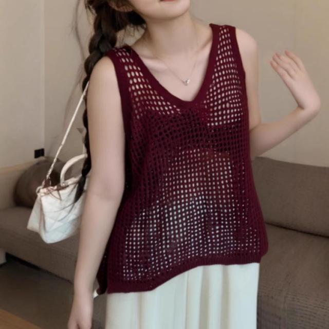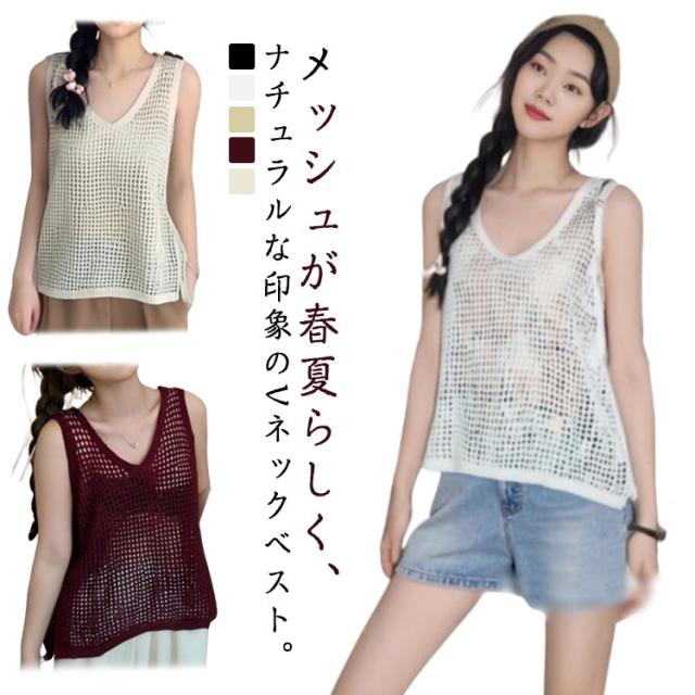 レディース Vネック ノースリーブ ベスト春夏 トップス サマーニット メッシュ ベスト ニットベスト メッシュニット 透け カジュアル ゆったり おしゃれ 透かし編み