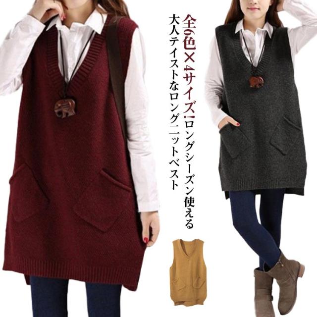 ニット ニットベスト チュニックベスト トップス ベスト ロング丈 レイヤード 重ね着 通勤 ロングベスト 春 秋冬 セーター シンプル 無地 着回し力 ノースリーブ
