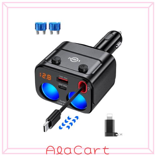 【186W シガーソケット 2連】 車 シガーソケット 充電器 5-IN-1 シガーソケット 増設 5台同時充電 カーチャージャー 巻取り式ケーブル Ty