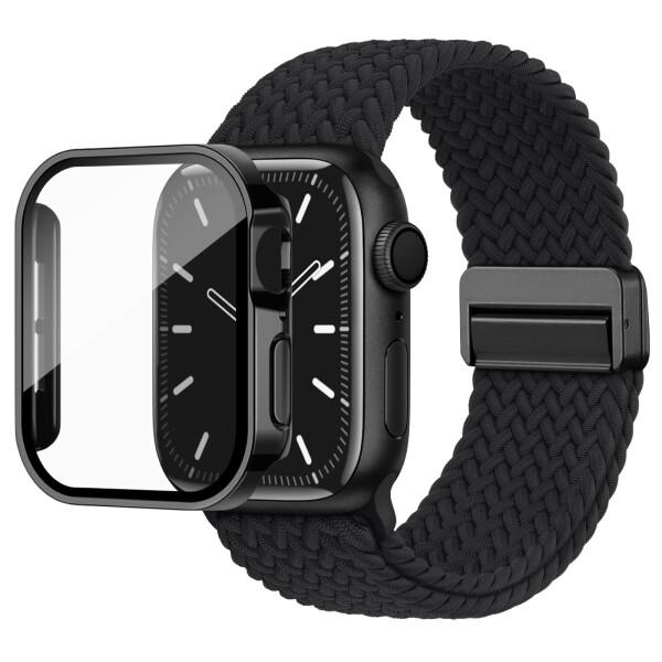 Knossen コンパチブル Apple Watch バンド ナイロン 編み込み 伸縮性 アップルウォッチ バンド マグネット 磁気 直角エッジ保護ケース付き Apple Watch ベルトとカバー 一体型 セット 耐衝撃 全面