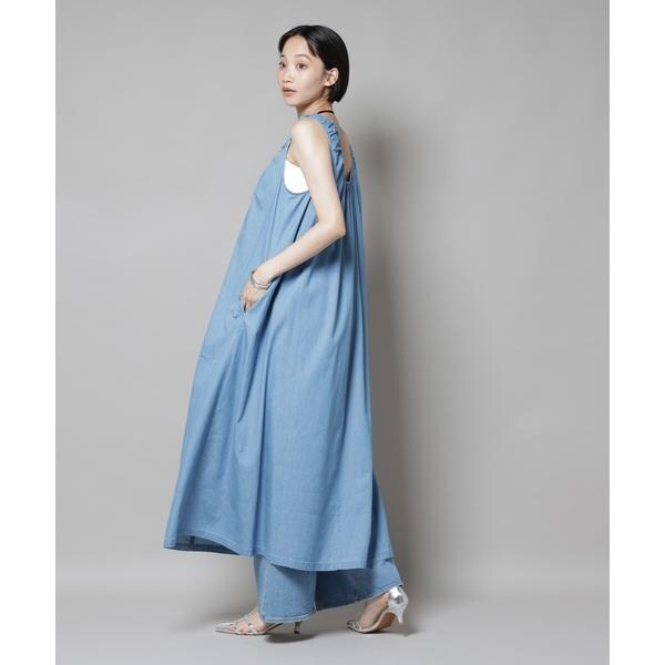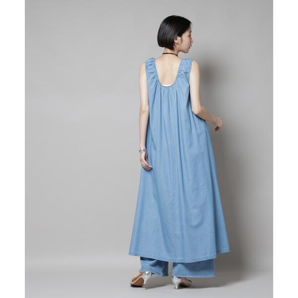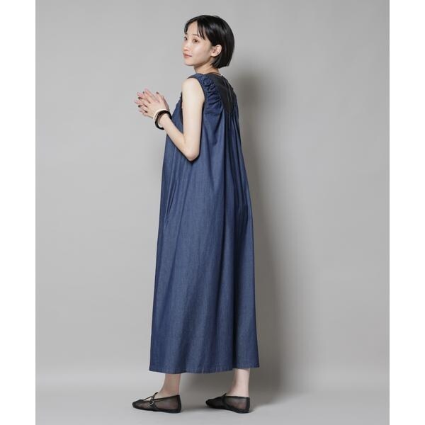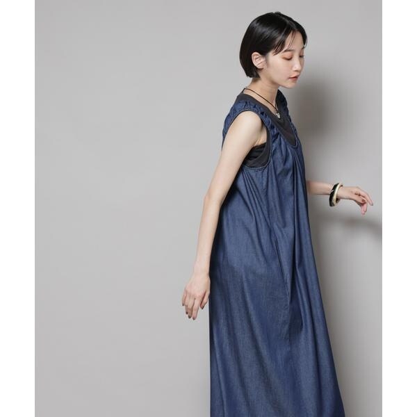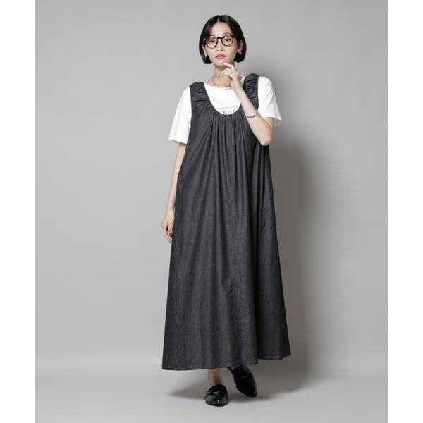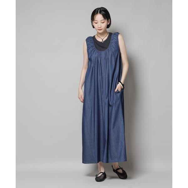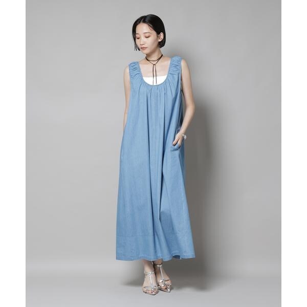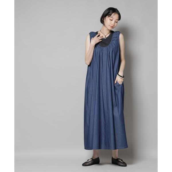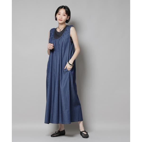 女性らしい着こなしが叶う、ギャザーデザインを効かせたデニムワンピース。軽く柔らかなデニム素材とゆったりしたシルエットで、リラックス感のあるコーディネートが完成します。