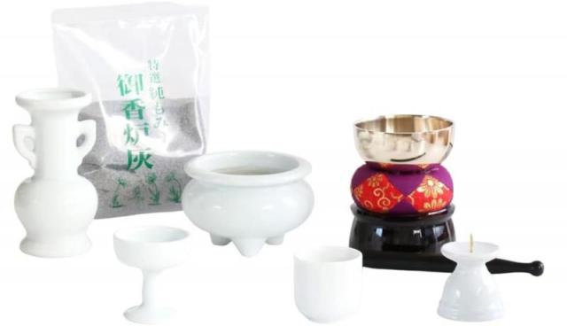 このセットは四十九日までの祭壇や上置き仏壇、ミニ仏壇に良く合います。陶器は岐阜県産で、穢れのない白色です。