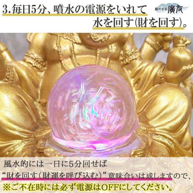 につきましては、風水的には一日に5分回せば“財を回す(財運を呼び込む)”意味合いは成しますので、ご不在時には必ず電源はOFFにしてください。
