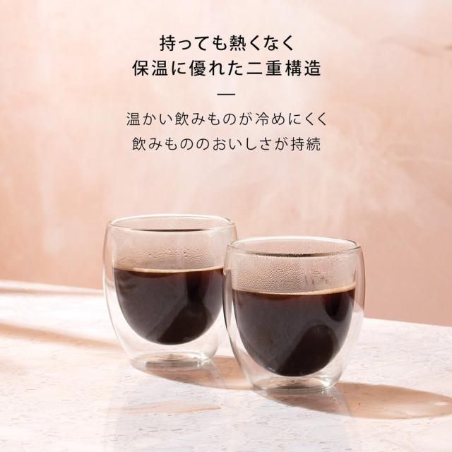 耐熱ガラスの二重構造で、温かい飲みものは温かく、冷たい飲みものは冷たいまま、飲みものの美味しさを持続させる、保温性、保冷性に優れたグラスです。また、温かい飲みものを入れても熱くて持てないということや、冷たい飲みものを入れても結露でグラスやテーブルが濡れるということがありません。