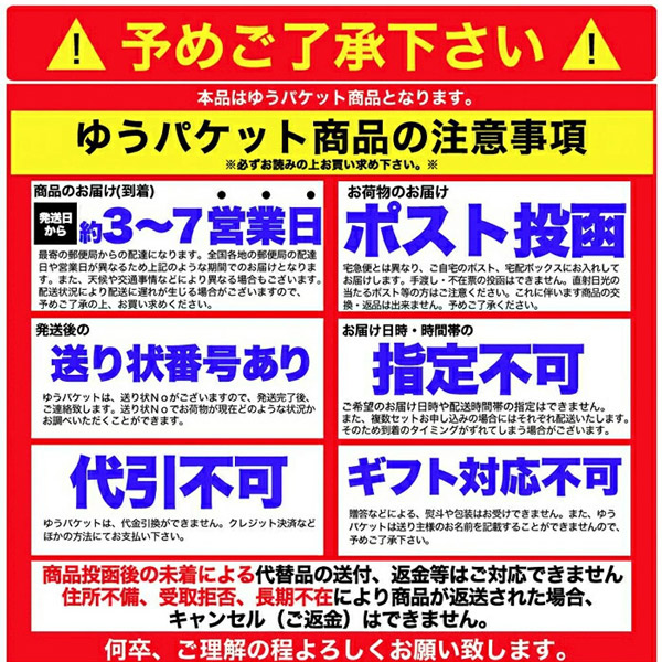 ・商品投函後の未着による代替品の送付、返金等はご対応できません。住所不備、受取拒否、長期不在により商品が返送された場合、キャンセル(返金)はできません。