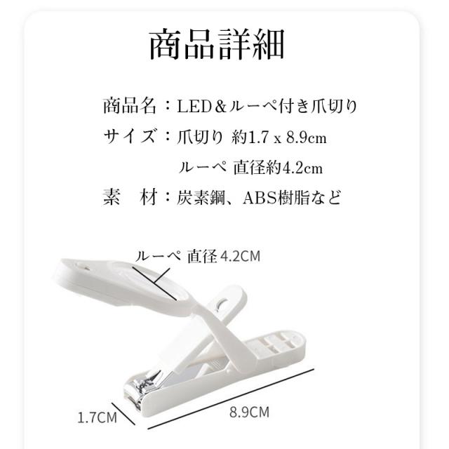 爪切り つめきり ルーペ付き 拡大鏡付き ライト付き ネイル ニッパー ネイルケア 老眼 高齢者 シニア 見やすい 切りやすい 白 ホワイト 母の日 ギフト 父の日 敬老の日 ルーペ付き爪切り