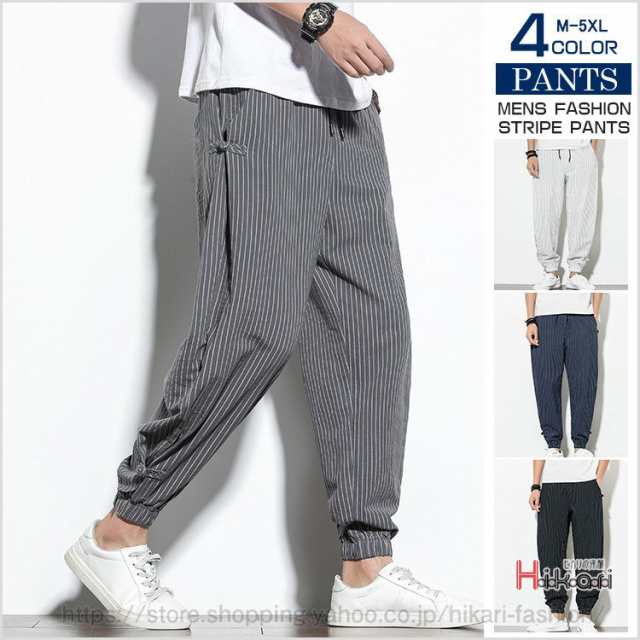 ジョガーパンツ メンズ ストライプパンツ ゆったり ウェストゴム エスニック ワイドパンツ カジュアル 綿麻素材