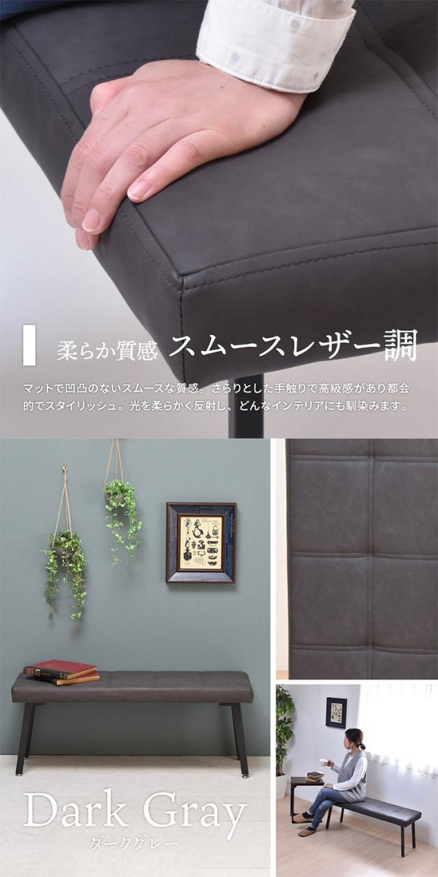 ■マットな質感と柔らかな手触りのPUレザーを使用したコンパクトサイズのダイニングベンチ。シャープなスクエア脚を使用し、スタイリッシュなデザインに。脚先にはアジャスターも付いていますので、ガタツキもなく安定した座りとなっています。