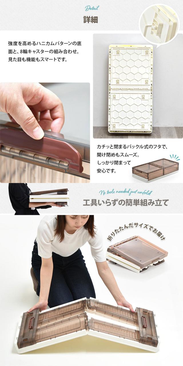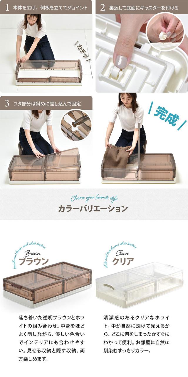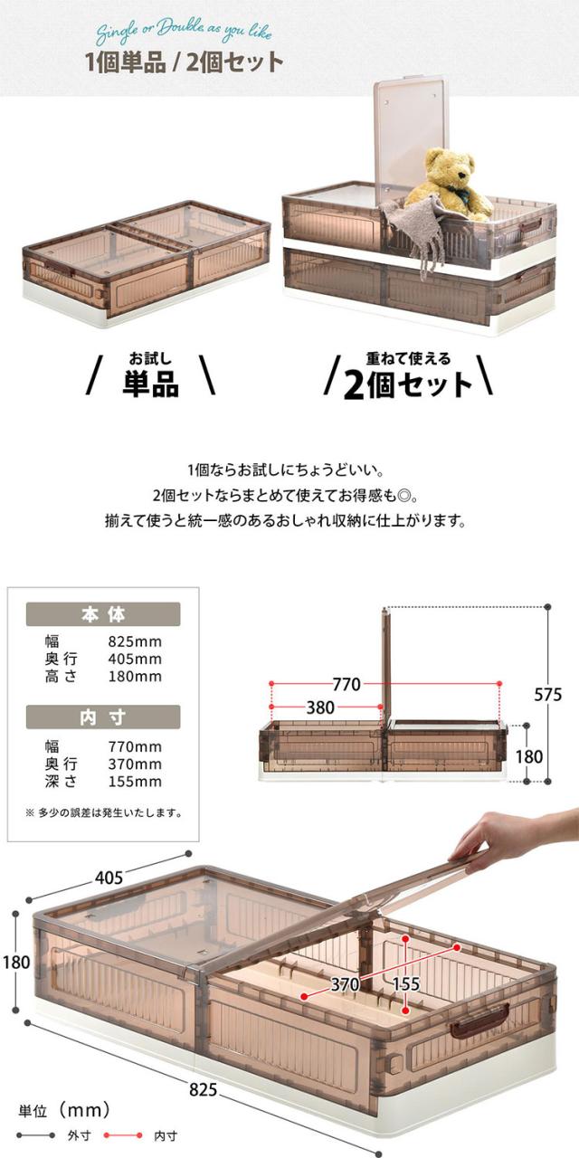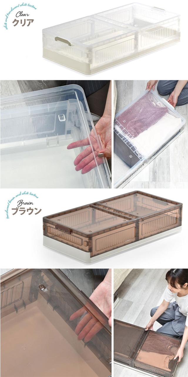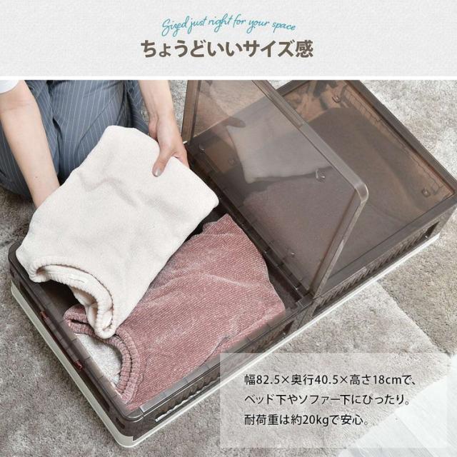■半透明で中身が見えるおしゃれなベッド下収納ボックスの2個セット。高さが18cmのボックスなので、18cm以上のスペースがあればベッド下だけでなくソファー下などのあらゆる隙間に収納ができます。間口も広く大容量の収納なのでありとあらゆるものが、収納できてリビングや寝室周りの整理整頓に非常に便利です。使わない時は折りたたんで小さく収納もできる機能性の高い収納ボックスです。