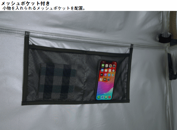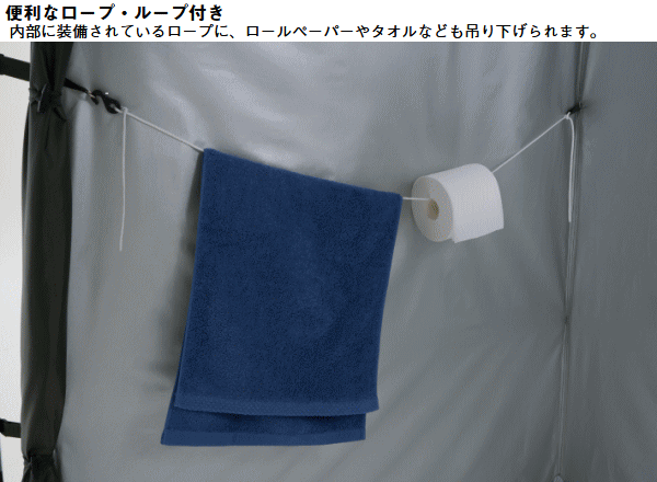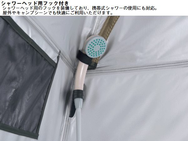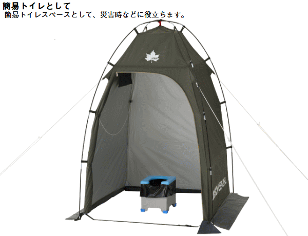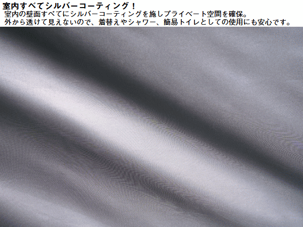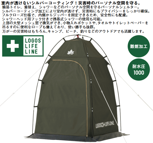 室内が透けないシルバーコーティング!災害時のパーソナル空間を守る。簡易トイレ、着替え、シャワーなどのパーソナル空間を守るパーソナルシェルター。シルバーコーティング加工により室内が透けず災害時にもプライバシーをしっかり確保。フルクローズ仕様で内側からジッパーを固定できるため安全性にも配慮。シャワーヘッド用フック付きで携帯式シャワーの使用も可能。上部の大型メッシュ窓で換気ができ小物入れポケットやタオルやトイレットペーパーを吊るすのに便利なロープも備えており使い勝手も抜群。万が一の災害時はもちろんキャンプ、ビーチ、釣りなどのアウトドアでも活躍します。■総重量約2.9kg■サイズ約全長120×幅120×高さ190cm■収納サイズ約縦12×横58×高さ12cm■耐水圧[フライシート]1000mm■構成:フライシート、ペグ、ロープ、収納バッグ、フレーム用収納袋、ハンマー、小物袋■主素材[フレーム]グラスファイバー[フライシート]難燃性ポリタフタ、シルバーコーティング[マッドスカート]PEラミネートクロス※耐水圧は摩擦や経年劣化とともに低下していきます。