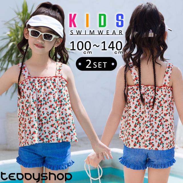 夏新作 キッズ 水着 キャミキニ セパレート タンキニ 女の子 トップス ショートパンツ 2点セット 花柄 フレア フリル デニム風 裏地付き 洋服見え パッド付き 一部サイズのみ 幼稚園 保育園 小学生 低学年 高学年 100 110 120 130 140 海 プール