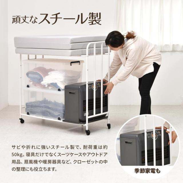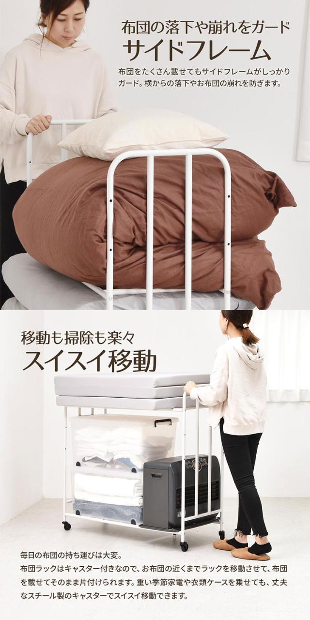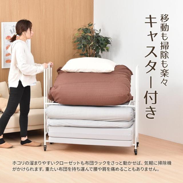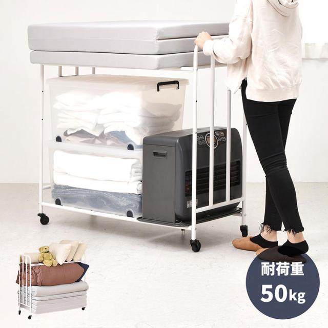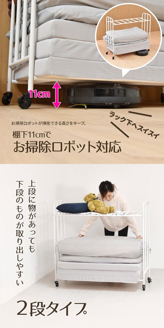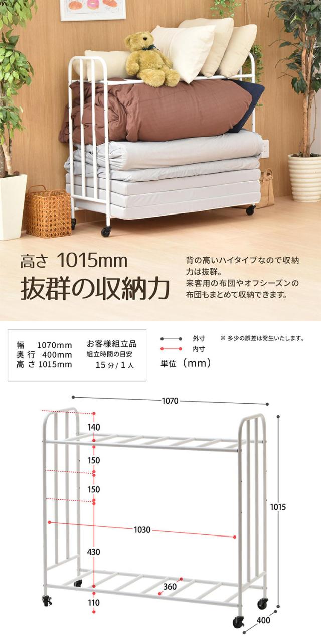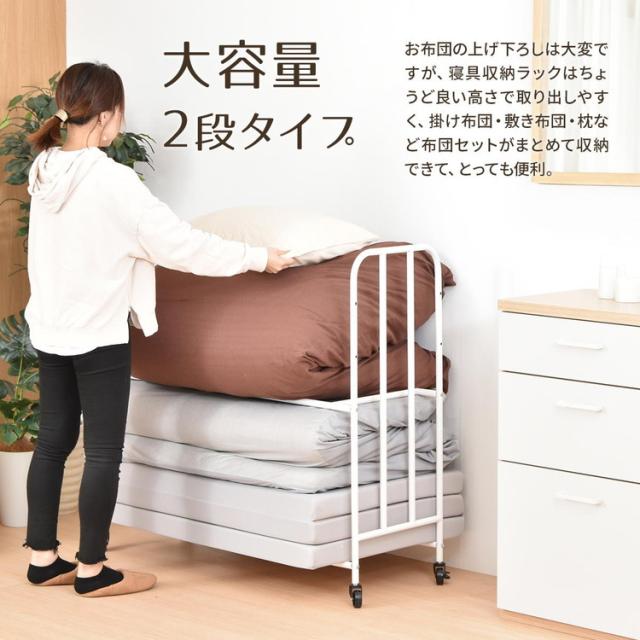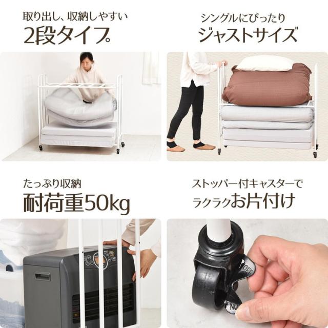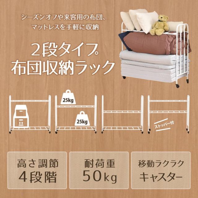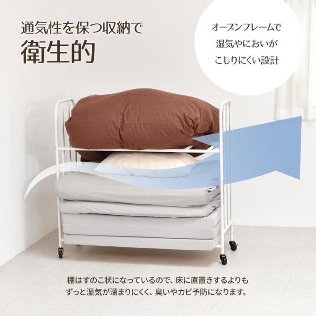 ■掛け布団や枕もまとめて収納できる、2段で大容量の布団収納ラック。丈夫なキャスターが付いていますので移動もラクラクです。通気性抜群の収納ラックは、床に直置きしませんので、湿気が溜まりにくく、臭いやカビ予防になります。収納する布団の厚みや枚数、折りたたみマットレスなどに合わせて、高さ調整も出来ますので、ご使用に応じた収納ができます。布団以外にも、下段の棚パイプの位置を上げることで、ボックス類などを置くことができます。丈夫で便利なキャスター付きなので、シーズンオフや来客用の布団、マットレスを手軽に収納します。