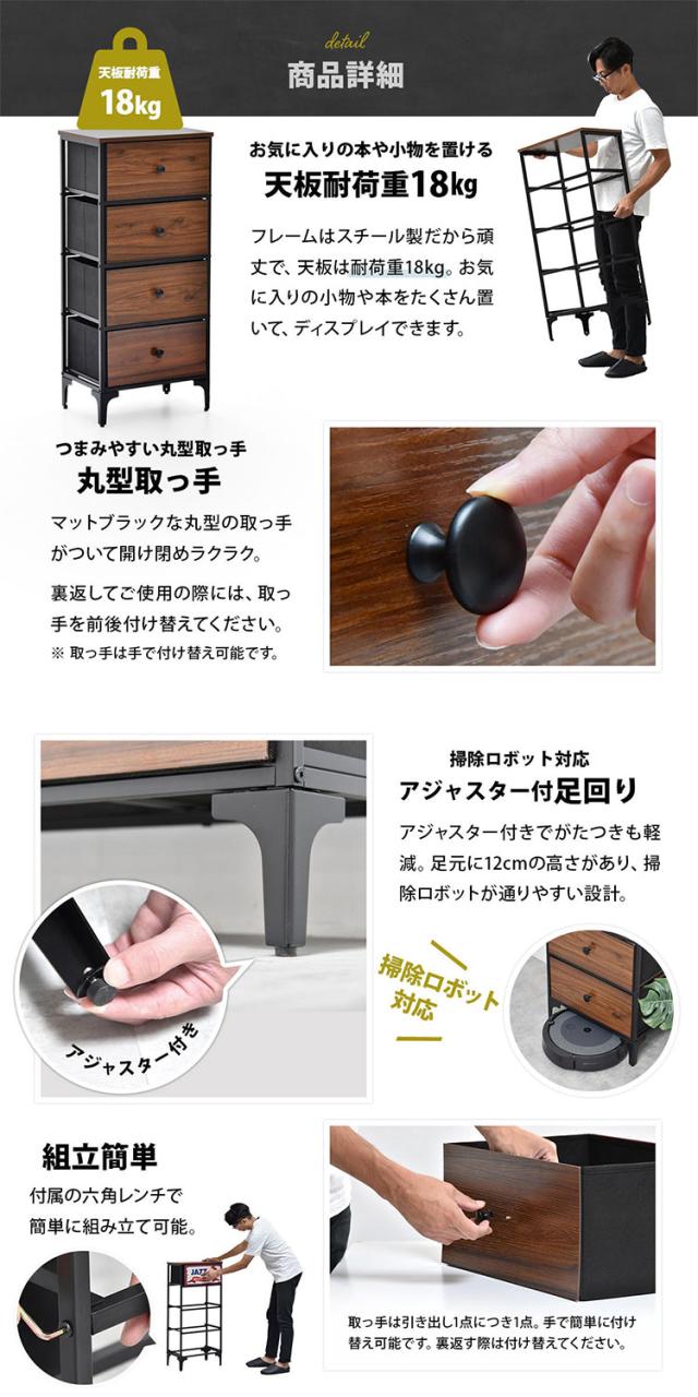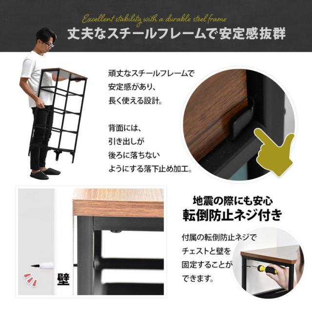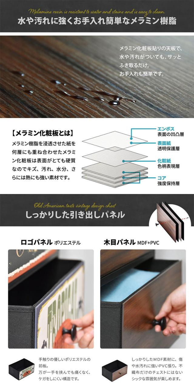 ■アメリカンヴィンテージの雰囲気がおしゃれな、リバーシブル収納チェスト。収納はリバーシブルタイプで片方はヴィンテージデザイン、もう一方はブラウンの木目調デザインとなっており、お部屋の雰囲気に合わせて変えることが出来ます。引き出しには通気性に優れた不織布を使用。カビや臭いの原因となる湿気がこもりにくく快適。底面にはMDFの底板が入っているので形崩れがしにくく、収納しやすい仕様になっています。