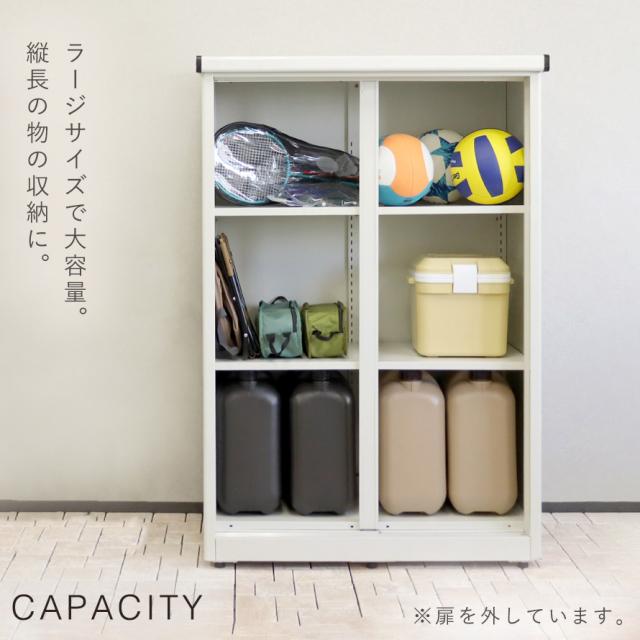 縦長のハイタイプなので大きなものも収納可能。可動棚の調整で縦長の物の収納に。