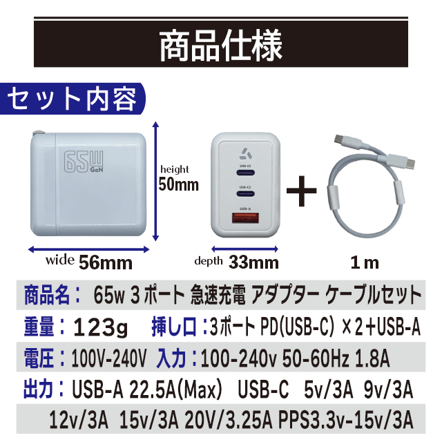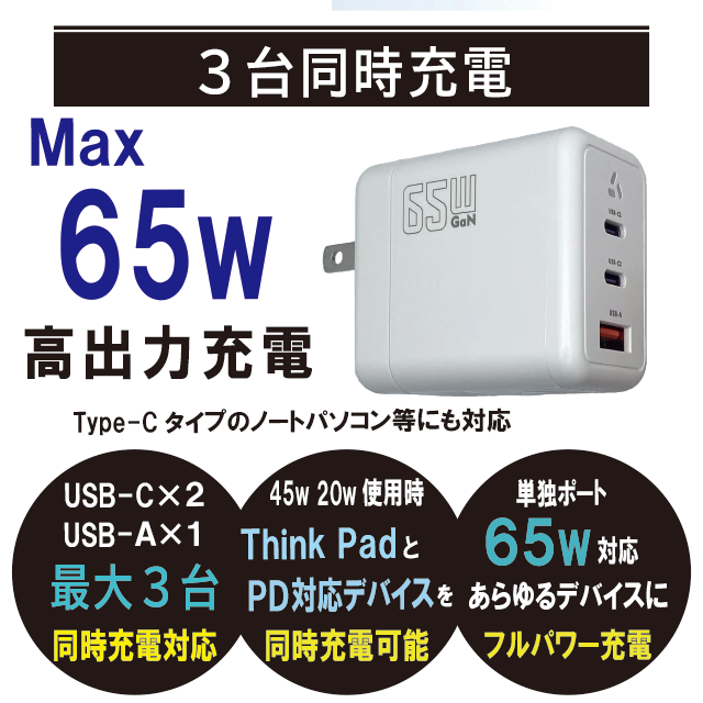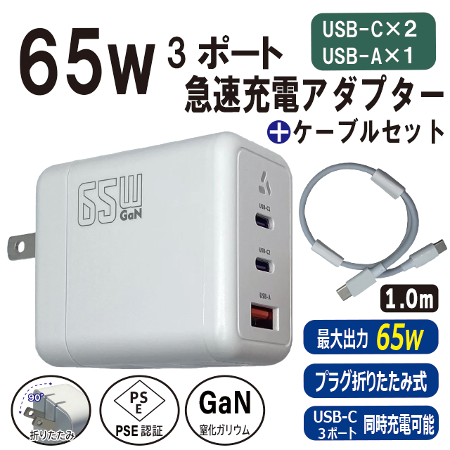 【 ケーブル付き ACアダプター 】期間限定特価! PD対応 65w 3ポート 急速充電 GaN 折畳式プラグ PSE認証 ノートパソコン コンセント Type-C USB-A Think Pad
