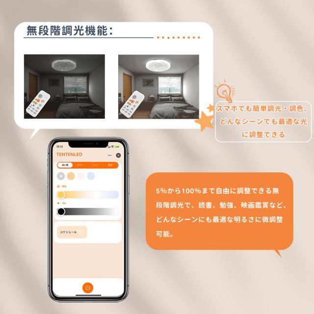 ★お好みの明るさや色温度に簡単に調整いただけます。シーンや気分に合わせて柔らかい暖色からさわやかな昼白色まで幅広く設定可能で、快適な空間作りをサポートします。リモコンまたはスマートデバイスから操作でき、使い勝手も抜群です。
