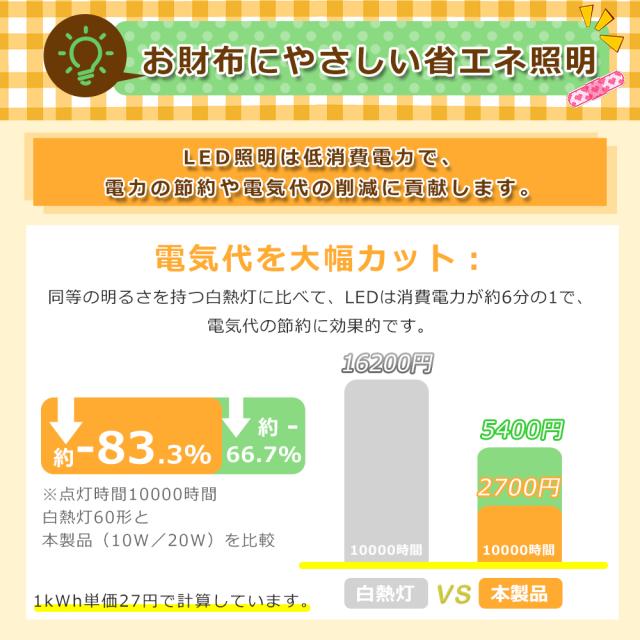 ★高効率LED光源を使用しており、消費電力が少なく、長寿命で、電気代を大幅に削減します。また、頻繁な電球交換の手間も省けます。